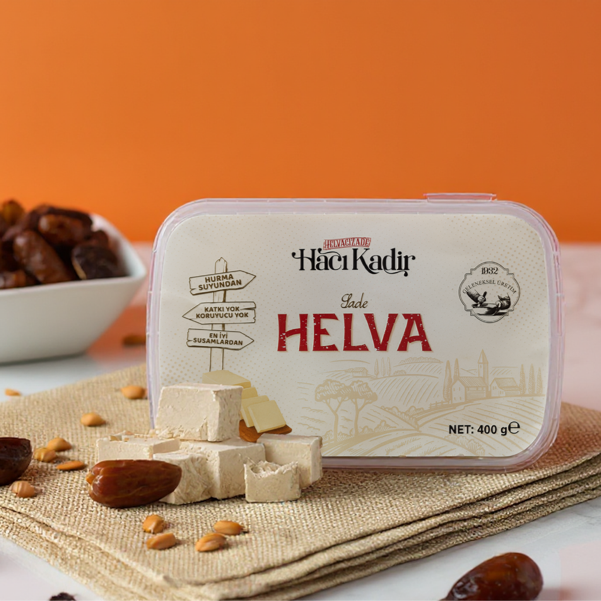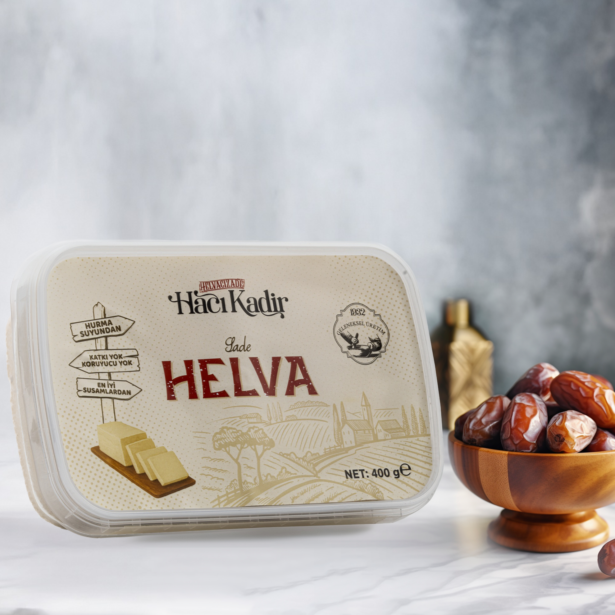 Geleneksel helva üretim yöntemlerine bağlı kalınarak, pancar şekeri kullanılmadan hurma suyuyla tatlandırılmıştır. En kaliteli susamların yetiştiği Muğla’nın Gökova ilçesindeki tarlalardan özenle toplanan susamlar, taş değirmenlerde tahine dönüştürüldükten sonra hurma suyu ve çöven otu suyuyla harmanlanır. Bakır kazanlarda, el ile kürekleme ve yoğurma aşamalarından geçirilerek kıvamına kavuşturulur. Türk Gıda Kodeksi’nde yer alan “Tahin Helvası Tebliği”ne uygun olarak üretilmiştir.